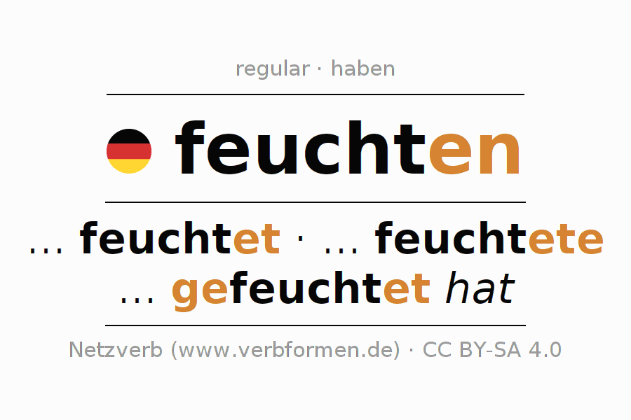 The conjugation of feuchten in Participle Present Perfect part of speech Active is feuchtend, gefeuchtet.The conjugation corresponds to certain grammatical rules. Likewise the requirements for the conjugation of the simple verb forms of feuchten in Participle. Comments ☆