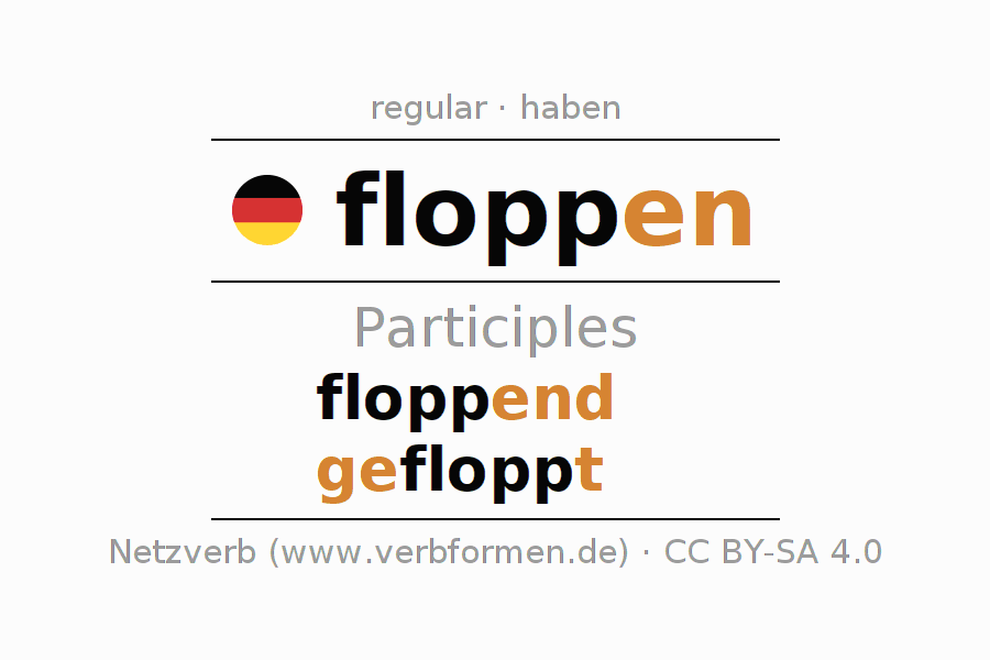 The conjugation of floppen in Participle Present Perfect part of speech Active is floppend, gefloppt.The conjugation corresponds to certain grammatical rules. Likewise the requirements for the conjugation of the simple verb forms of floppen in Participle. Comments ☆