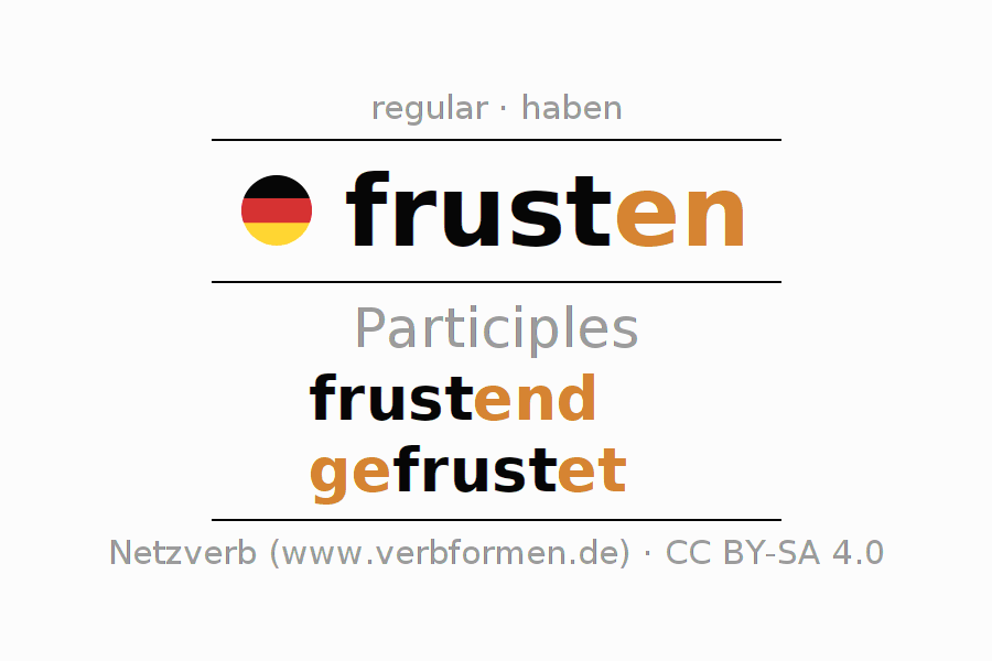 The conjugation of frusten in Participle Present Perfect part of speech Active is frustend, gefrustet.The conjugation corresponds to certain grammatical rules. Likewise the requirements for the conjugation of the simple verb forms of frusten in Participle. Comments ☆