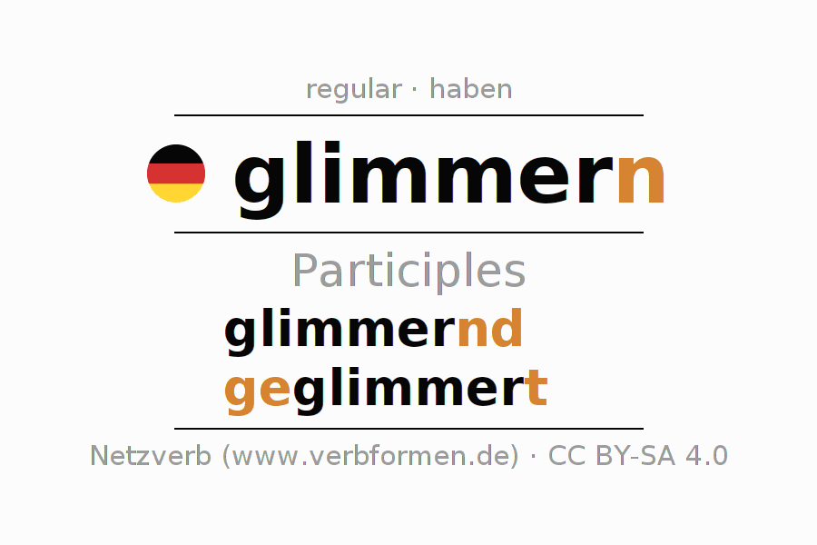 The conjugation of glimmern in Participle Present Perfect part of speech Active is glimmernd, geglimmert.The conjugation corresponds to certain grammatical rules. Likewise the requirements for the conjugation of the simple verb forms of glimmern in Participle. Comments ☆