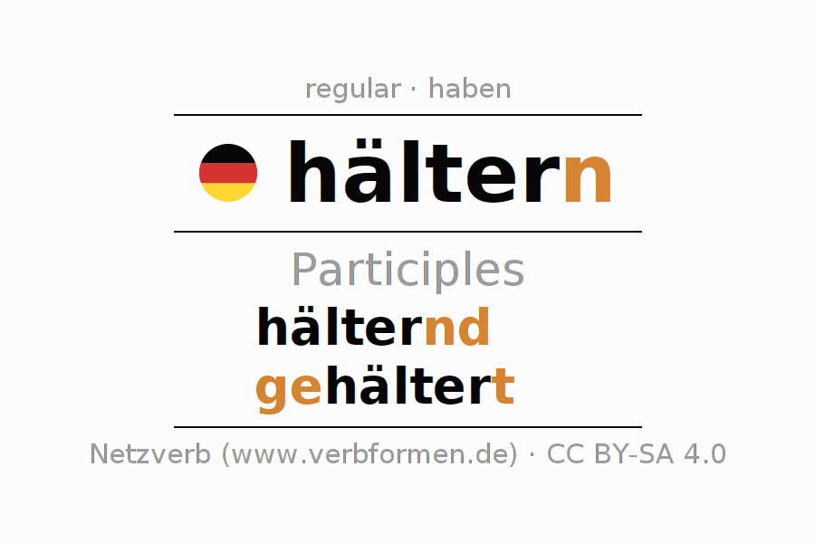 The conjugation of hältern in Participle Present Perfect part of speech Active is hälternd, gehältert.The conjugation corresponds to certain grammatical rules. Likewise the requirements for the conjugation of the simple verb forms of hältern in Participle. Comments ☆
