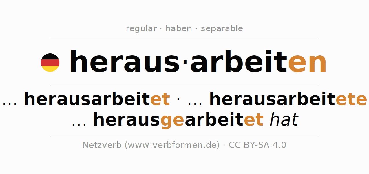 The conjugation of herausarbeiten in Participle Present Perfect part of speech Active is herausarbeitend, herausgearbeitet.The conjugation corresponds to certain grammatical rules. Likewise the requirements for the conjugation of the simple verb forms of herausarbeiten in Participle. Comments ☆