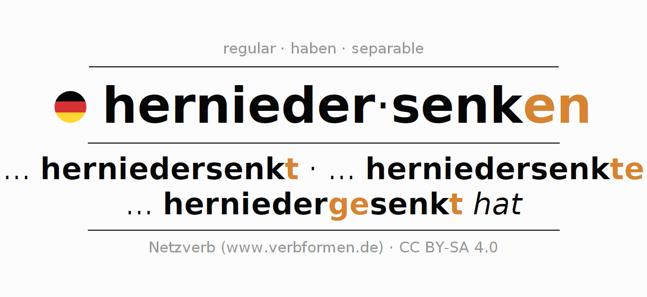 The conjugation of herniedersenken in Participle Present Perfect part of speech Active is herniedersenkend, herniedergesenkt.The conjugation corresponds to certain grammatical rules. Likewise the requirements for the conjugation of the simple verb forms of herniedersenken in Participle. Comments ☆