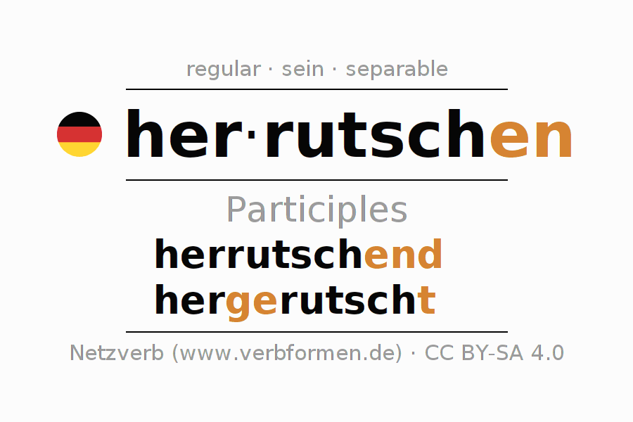 The conjugation of herrutschen in Participle Present Perfect part of speech Active is herrutschend, hergerutscht.The conjugation corresponds to certain grammatical rules. Likewise the requirements for the conjugation of the simple verb forms of herrutschen in Participle. Comments ☆
