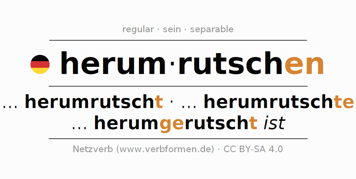 The conjugation of herumrutschen in Participle Present Perfect part of speech Active is herumrutschend, herumgerutscht.The conjugation corresponds to certain grammatical rules. Likewise the requirements for the conjugation of the simple verb forms of herumrutschen in Participle. Comments ☆