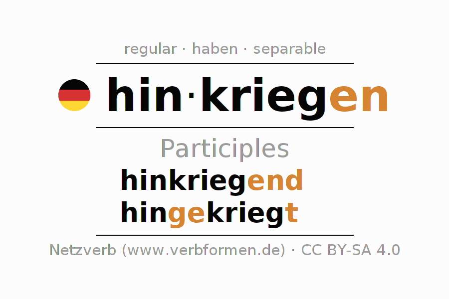 The conjugation of hinkriegen in Participle Present Perfect part of speech Active is hinkriegend, hingekriegt.The conjugation corresponds to certain grammatical rules. Likewise the requirements for the conjugation of the simple verb forms of hinkriegen in Participle. Comments ☆