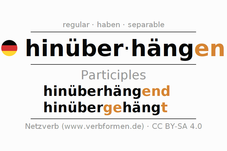 The verb hinüberhängen (regelm) fully conjugated in all persons and numbers in the Participle Present Perfect