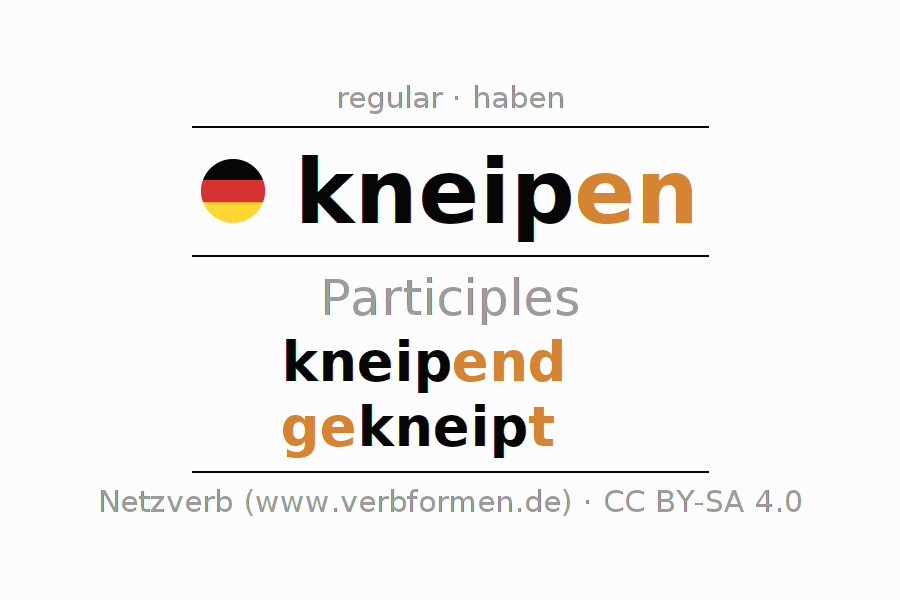 The conjugation of kneipen in Participle Present Perfect part of speech Active is kneipend, gekneipt.The conjugation corresponds to certain grammatical rules. Likewise the requirements for the conjugation of the simple verb forms of kneipen in Participle. Comments ☆