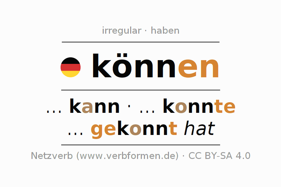 The conjugation of können in Participle Present Perfect part of speech Active is könnend, gekonnt.The conjugation corresponds to certain grammatical rules. Likewise the requirements for the conjugation of the simple verb forms of können in Participle. 2Comments ☆5.0