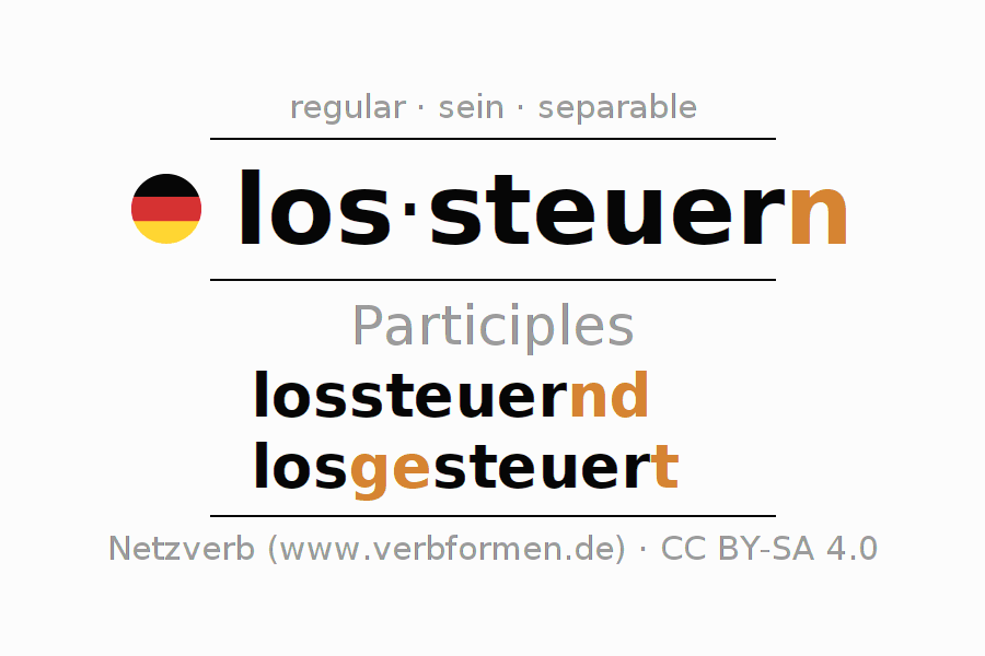 The conjugation of lossteuern in Participle Present Perfect part of speech Active is lossteuernd, losgesteuert.The conjugation corresponds to certain grammatical rules. Likewise the requirements for the conjugation of the simple verb forms of lossteuern in Participle. Comments ☆