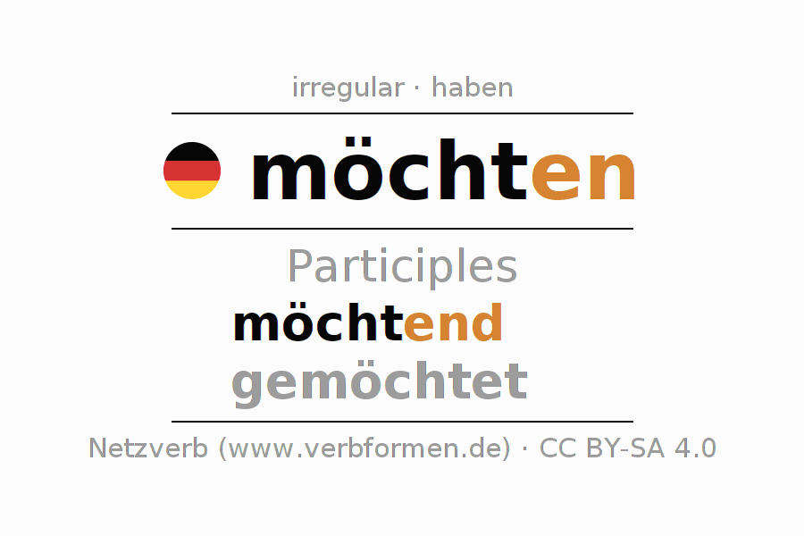 The conjugation of möchten in Participle Present Perfect part of speech Active is möchtend, gemöchtet.The conjugation corresponds to certain grammatical rules. Likewise the requirements for the conjugation of the simple verb forms of möchten in Participle. 2Comments ☆