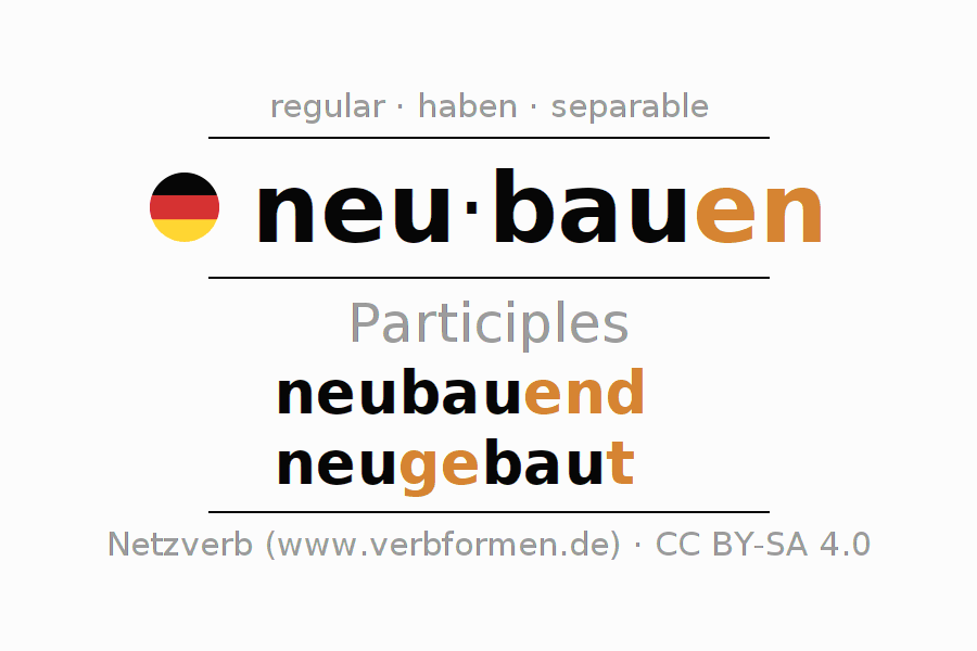 The conjugation of neubauen in Participle Present Perfect part of speech Active is neubauend, neugebaut.The conjugation corresponds to certain grammatical rules. Likewise the requirements for the conjugation of the simple verb forms of neubauen in Participle. Comments ☆