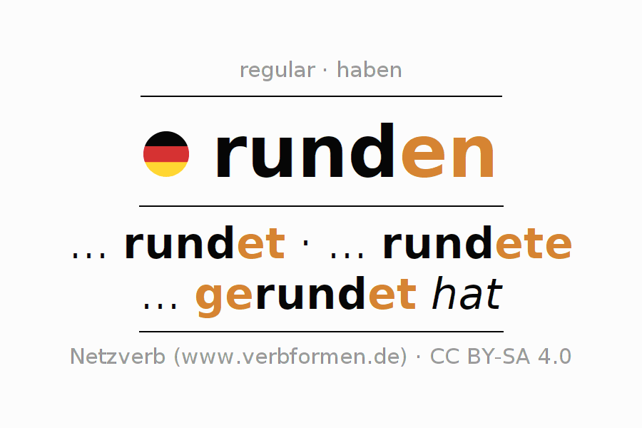 The conjugation of runden in Participle Present Perfect part of speech Active is rundend, gerundet.The conjugation corresponds to certain grammatical rules. Likewise the requirements for the conjugation of the simple verb forms of runden in Participle. Comments ☆
