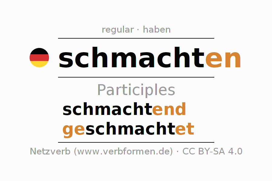 The conjugation of schmachten in Participle Present Perfect part of speech Active is schmachtend, geschmachtet.The conjugation corresponds to certain grammatical rules. Likewise the requirements for the conjugation of the simple verb forms of schmachten in Participle. Comments ☆