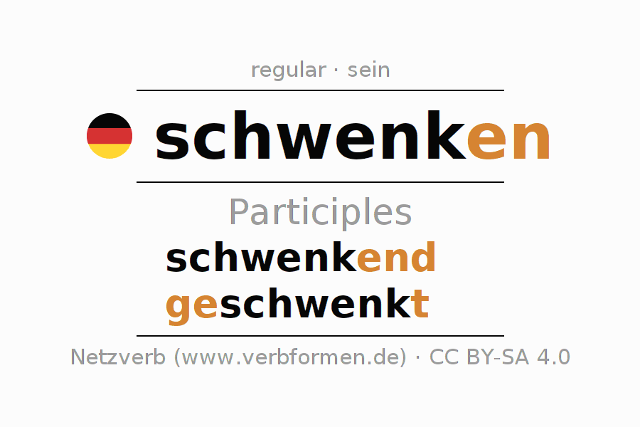 The conjugation of schwenken in Participle Present Perfect part of speech Active is schwenkend, geschwenkt.The conjugation corresponds to certain grammatical rules. Likewise the requirements for the conjugation of the simple verb forms of schwenken in Participle. Comments ☆