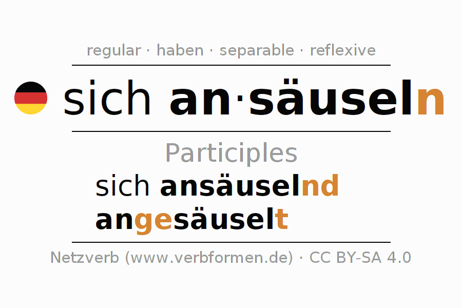 The conjugation of sich ansäuseln in Participle Present Perfect part of speech Active is sich ansäuselnd, angesäuselt.The conjugation corresponds to certain grammatical rules. Likewise the requirements for the conjugation of the simple verb forms of ansäuseln in Participle. Comments ☆