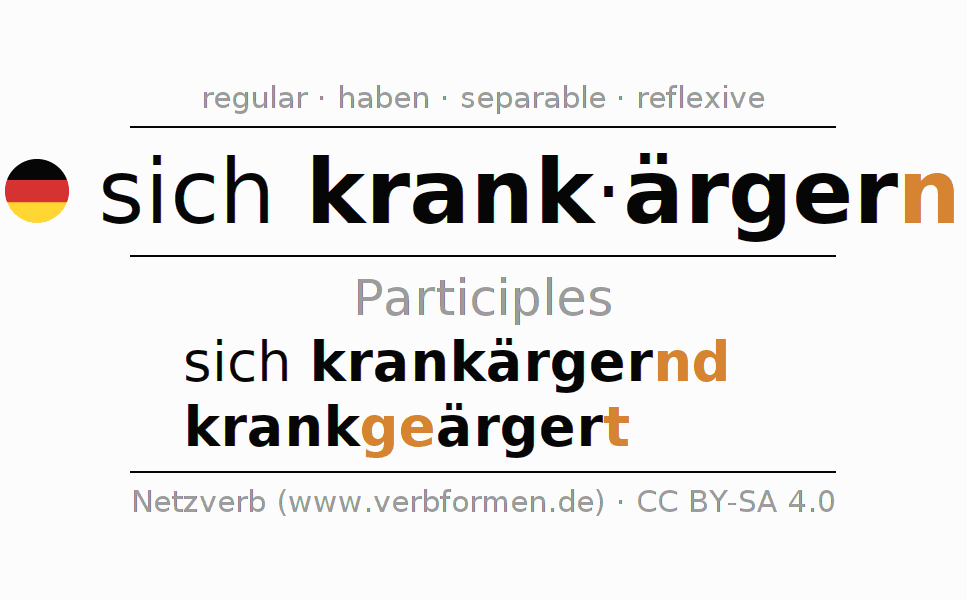 The conjugation of sich krankärgern in Participle Present Perfect part of speech Active is sich krankärgernd, krankgeärgert.The conjugation corresponds to certain grammatical rules. Likewise the requirements for the conjugation of the simple verb forms of krankärgern in Participle. Comments ☆