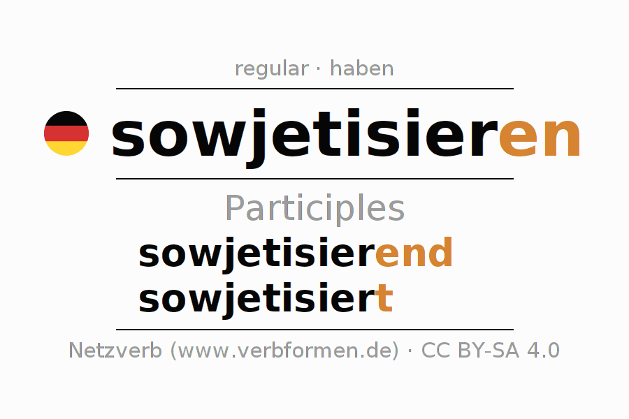 The conjugation of sowjetisieren in Participle Present Perfect part of speech Active is sowjetisierend, sowjetisiert.The conjugation corresponds to certain grammatical rules. Likewise the requirements for the conjugation of the simple verb forms of sowjetisieren in Participle. Comments ☆
