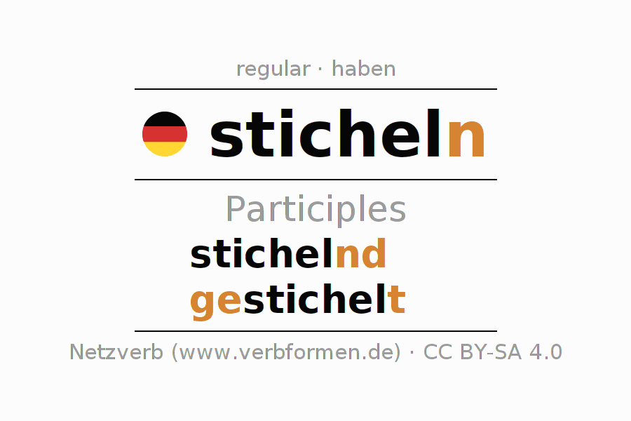The conjugation of sticheln in Participle Present Perfect part of speech Active is stichelnd, gestichelt.The conjugation corresponds to certain grammatical rules. Likewise the requirements for the conjugation of the simple verb forms of sticheln in Participle. Comments ☆