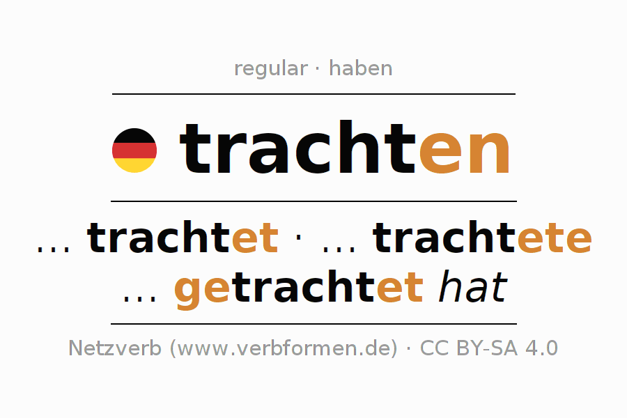 The conjugation of trachten in Participle Present Perfect part of speech Active is trachtend, getrachtet.The conjugation corresponds to certain grammatical rules. Likewise the requirements for the conjugation of the simple verb forms of trachten in Participle. Comments ☆