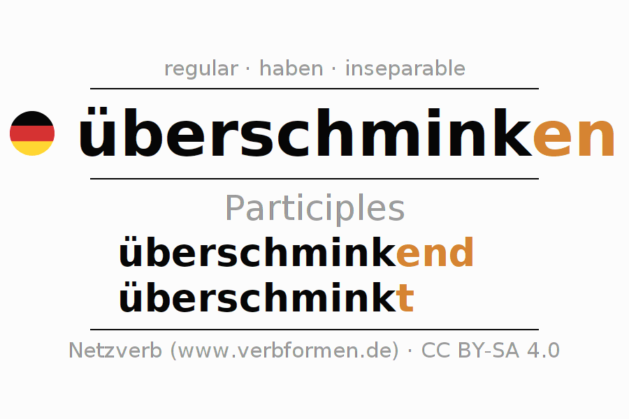 The conjugation of überschminken in Participle Present Perfect part of speech Active is überschminkend, überschminkt.The conjugation corresponds to certain grammatical rules. Likewise the requirements for the conjugation of the simple verb forms of überschminken in Participle. Comments ☆