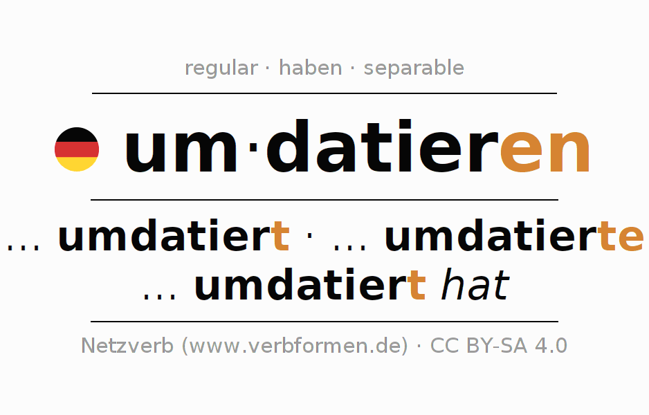 The conjugation of umdatieren in Participle Present Perfect part of speech Active is umdatierend, umdatiert.The conjugation corresponds to certain grammatical rules. Likewise the requirements for the conjugation of the simple verb forms of umdatieren in Participle. Comments ☆
