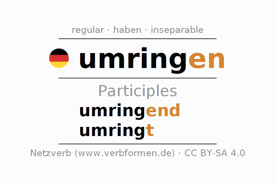 The conjugation of umringen in Participle Present Perfect part of speech Active is umringend, umringt.The conjugation corresponds to certain grammatical rules. Likewise the requirements for the conjugation of the simple verb forms of umringen in Participle. Comments ☆
