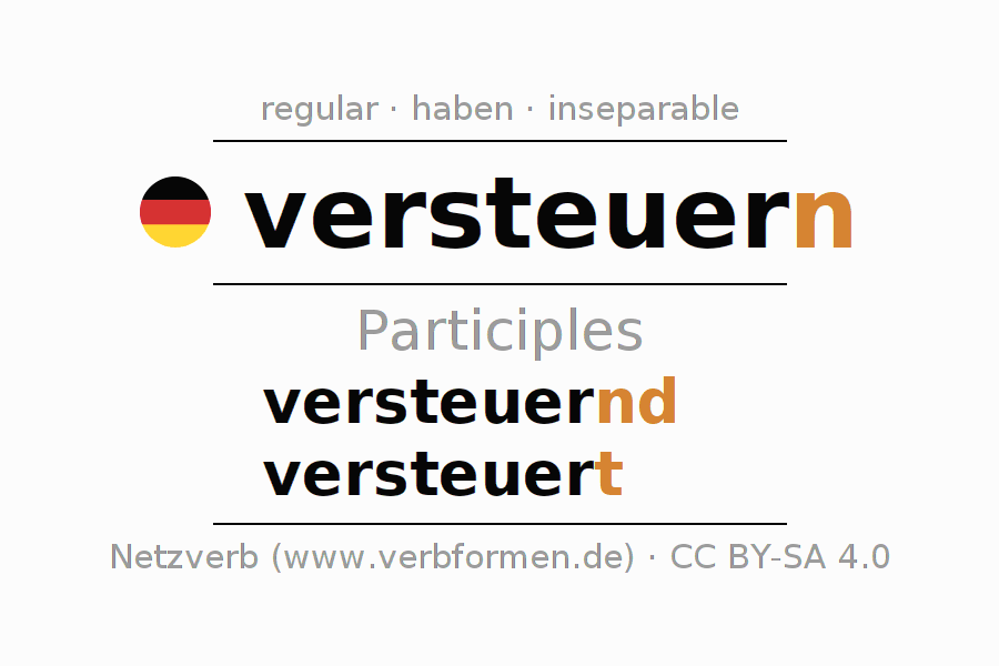The conjugation of versteuern in Participle Present Perfect part of speech Active is versteuernd, versteuert.The conjugation corresponds to certain grammatical rules. Likewise the requirements for the conjugation of the simple verb forms of versteuern in Participle. Comments ☆