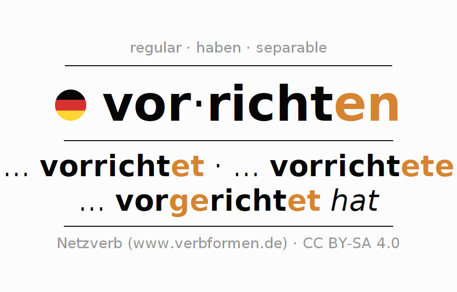 The conjugation of vorrichten in Participle Present Perfect part of speech Active is vorrichtend, vorgerichtet.The conjugation corresponds to certain grammatical rules. Likewise the requirements for the conjugation of the simple verb forms of vorrichten in Participle. Comments ☆