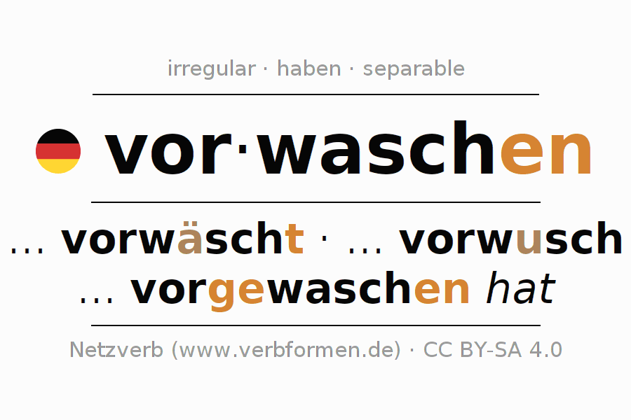 The conjugation of vorwaschen in Participle Present Perfect part of speech Active is vorwaschend, vorgewaschen.The conjugation corresponds to certain grammatical rules. Likewise the requirements for the conjugation of the simple verb forms of vorwaschen in Participle. Comments ☆