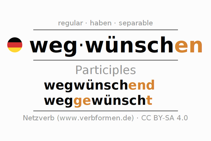 The conjugation of wegwünschen in Participle Present Perfect part of speech Active is wegwünschend, weggewünscht.The conjugation corresponds to certain grammatical rules. Likewise the requirements for the conjugation of the simple verb forms of wegwünschen in Participle. Comments ☆
