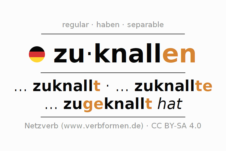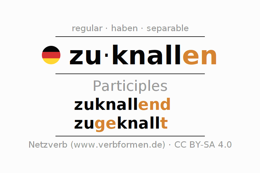The conjugation of zuknallen in Participle Present Perfect part of speech Active is zuknallend, zugeknallt.The conjugation corresponds to certain grammatical rules. Likewise the requirements for the conjugation of the simple verb forms of zuknallen in Participle. Comments ☆