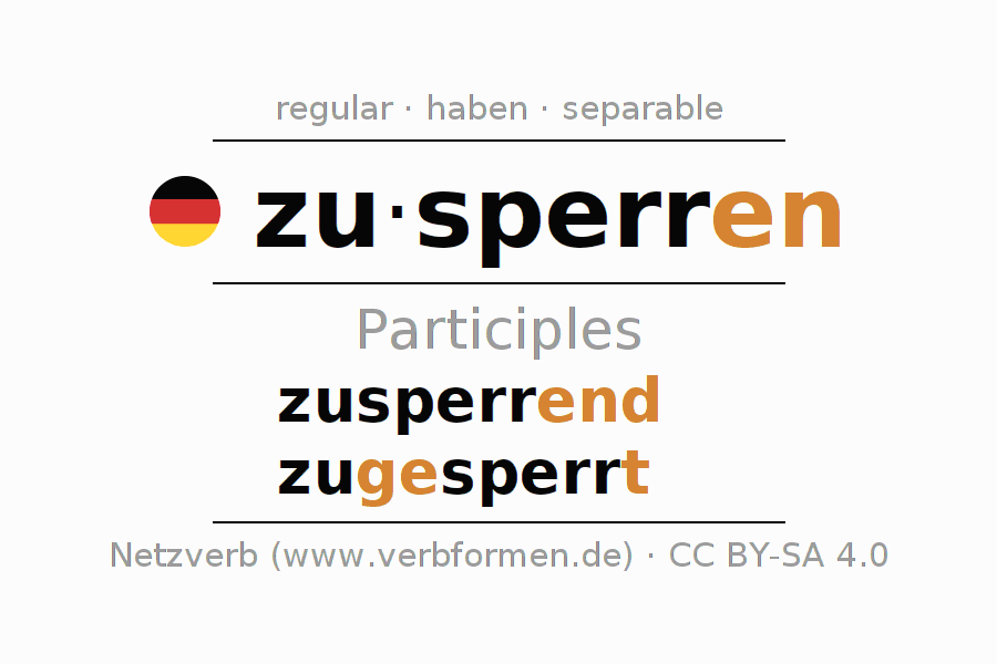The conjugation of zusperren in Participle Present Perfect part of speech Active is zusperrend, zugesperrt.The conjugation corresponds to certain grammatical rules. Likewise the requirements for the conjugation of the simple verb forms of zusperren in Participle. Comments ☆