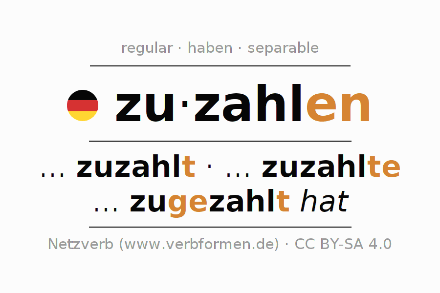 The conjugation of zuzahlen in Participle Present Perfect part of speech Active is zuzahlend, zugezahlt.The conjugation corresponds to certain grammatical rules. Likewise the requirements for the conjugation of the simple verb forms of zuzahlen in Participle. Comments ☆
