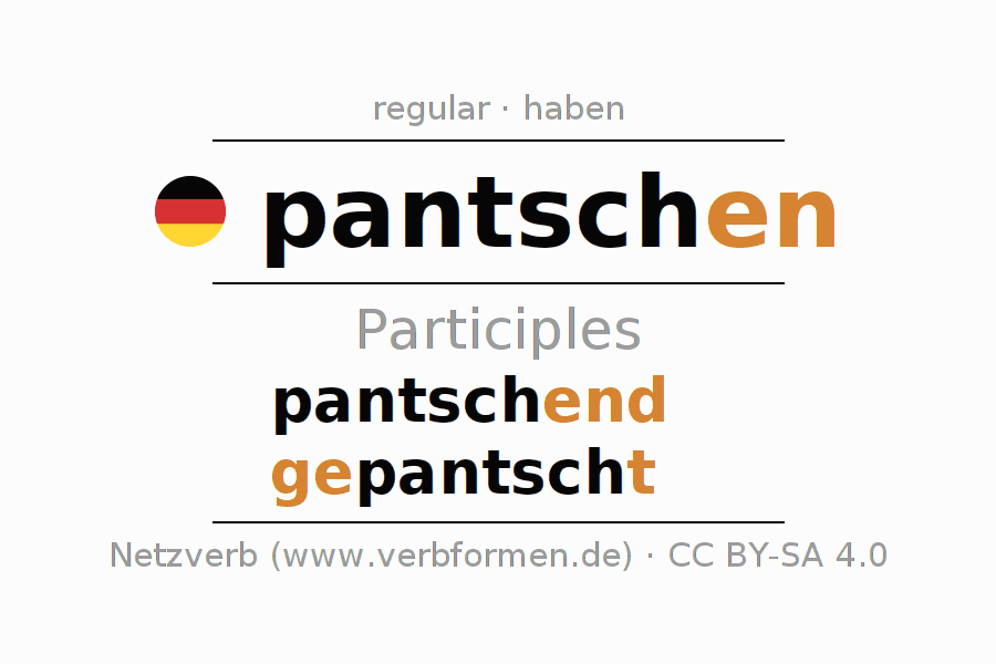 The verb pantschen fully conjugated in all persons and numbers in the Participle Present Perfect