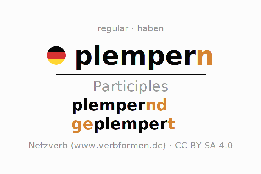 The verb plempern fully conjugated in all persons and numbers in the Participle Present Perfect