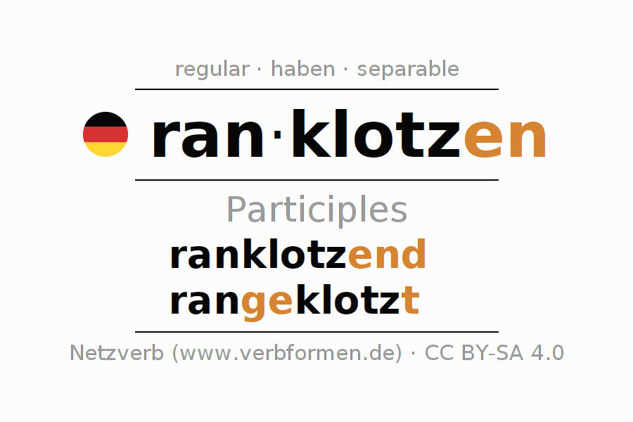 The verb ranklotzen fully conjugated in all persons and numbers in the Participle Present Perfect