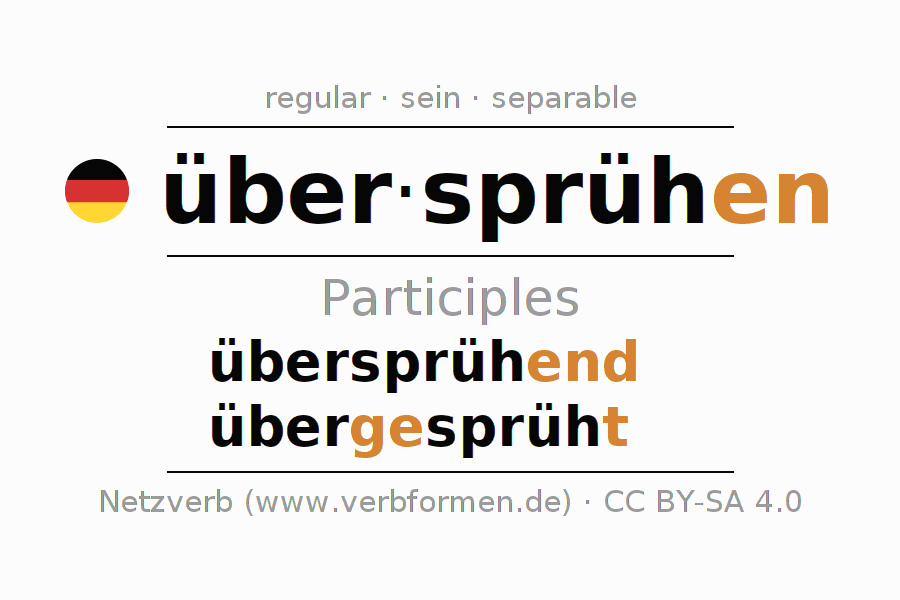 The verb über-sprühen (ist) fully conjugated in all persons and numbers in the Participle Present Perfect