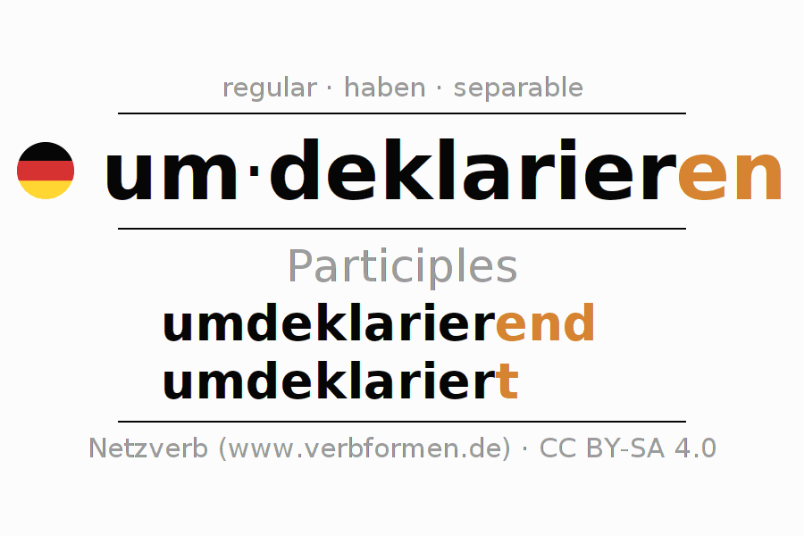 The verb umdeklarieren fully conjugated in all persons and numbers in the Participle Present Perfect