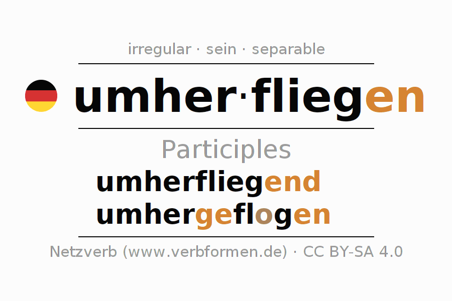 The verb umherfliegen fully conjugated in all persons and numbers in the Participle Present Perfect