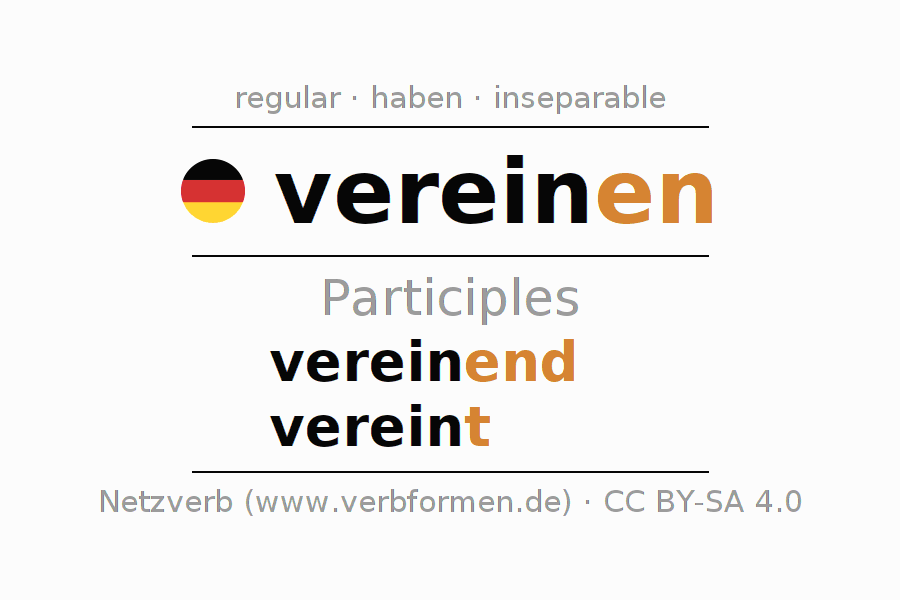 The verb vereinen fully conjugated in all persons and numbers in the Participle Present Perfect