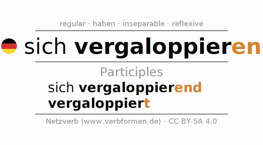 The participles of sich vergaloppieren (be mistaken, err) are: sich vergaloppierend, vergaloppiert. For participle I, the ending -end (suffix) is added to the base galoppier (verb stem). To form the past participle, the regular ending -t (suffix) is added to the base galoppier. Since the verb has unstressed first parts (prefixes) or unstressed syllables in the base, the participle II is formed without ge-. The formation of the forms corresponds to the grammatical rules for the conjugation of verbs in the participle. Comments