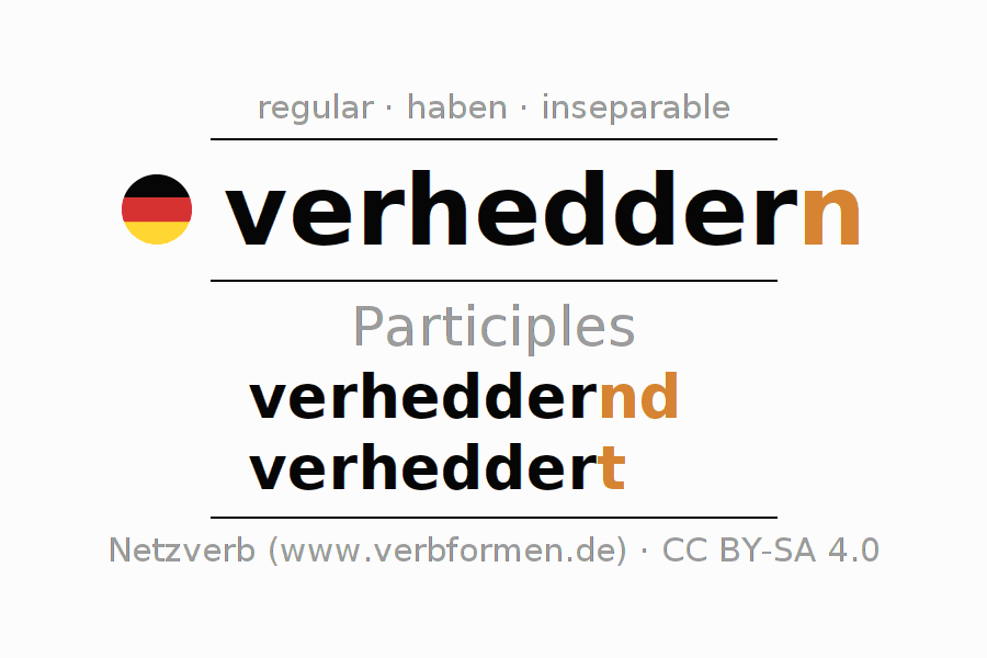 The verb verheddern fully conjugated in all persons and numbers in the Participle Present Perfect