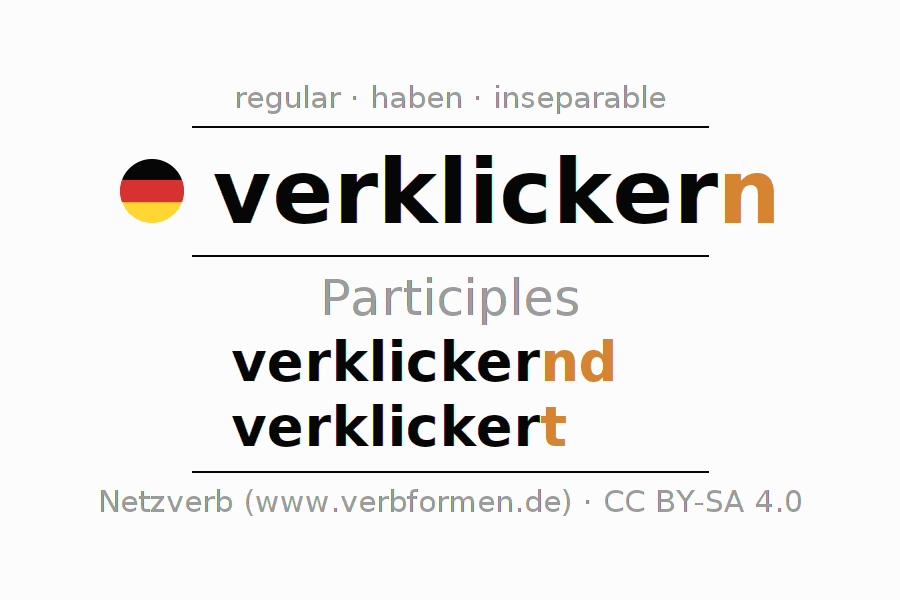 The verb verklickern fully conjugated in all persons and numbers in the Participle Present Perfect