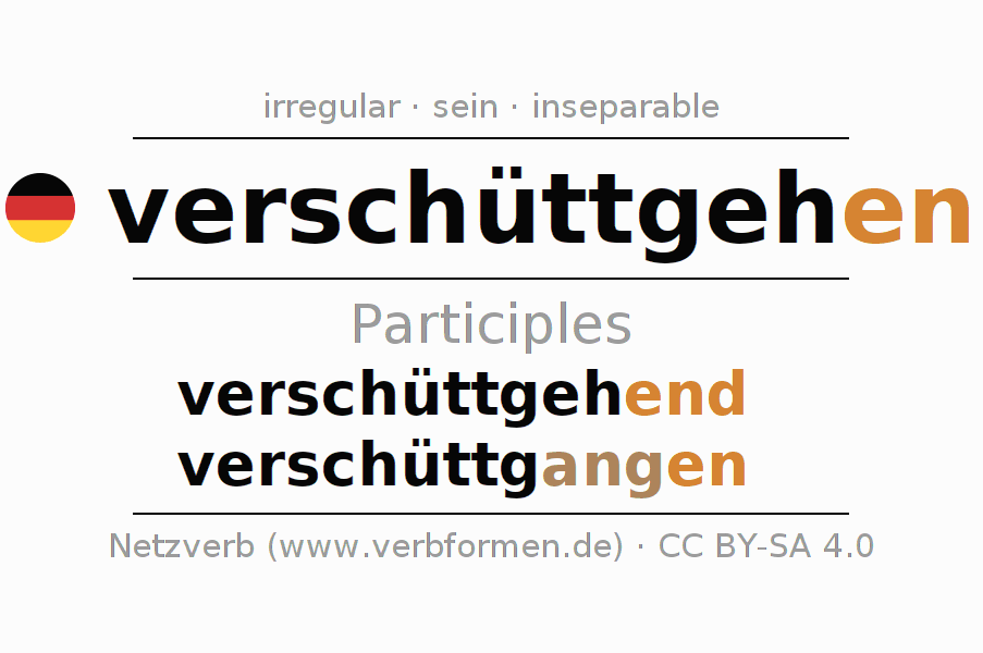The verb verschüttgehen fully conjugated in all persons and numbers in the Participle Present Perfect