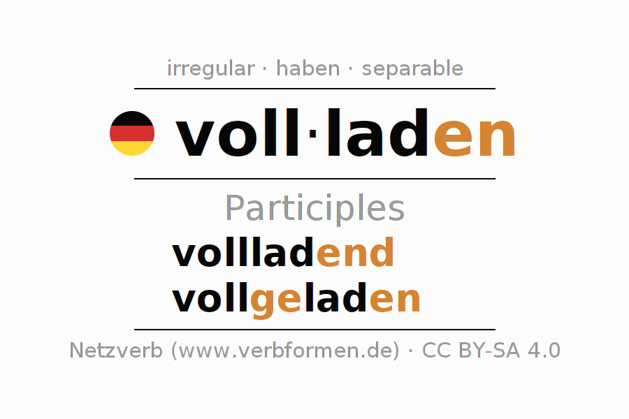 The verb vollladen fully conjugated in all persons and numbers in the Participle Present Perfect