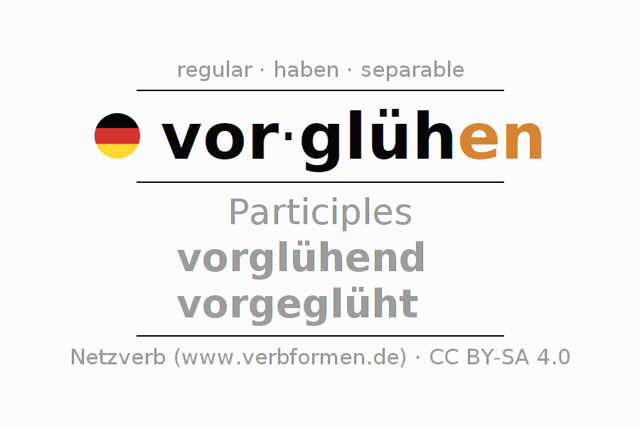 The verb vorglühen fully conjugated in all persons and numbers in the Participle Present Perfect