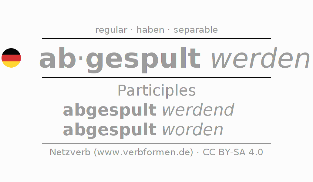 The conjugation of abspulen in Participle Present Perfect part of speech Passive is abgespult werdend, abgespult worden.The conjugation corresponds to certain grammatical rules. Likewise the requirements for the conjugation of the simple verb forms of abspulen in Participle. Comments ☆