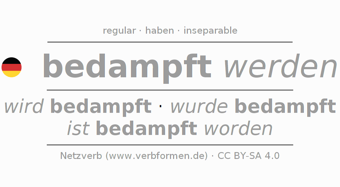 The conjugation of bedampfen in Participle Present Perfect part of speech Passive is bedampft werdend, bedampft worden.The conjugation corresponds to certain grammatical rules. Likewise the requirements for the conjugation of the simple verb forms of bedampfen in Participle. Comments ☆
