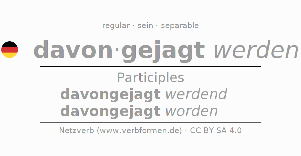 The conjugation of davonjagen in Participle Present Perfect part of speech Passive is davongejagt werdend, davongejagt worden.The conjugation corresponds to certain grammatical rules. Likewise the requirements for the conjugation of the simple verb forms of davonjagen in Participle. Comments ☆